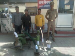 आज गुरुवार को उ0नि0 सुमित सिंह मय हमराह द्वारा ग्राम भैसाड़ पुल से मुकदमा उपरोक्त मे नामित अभियुक्तगण 1.किशन यादव पुत्र दुर्गेश यादव 4.वाहिद अहमद पुत्र बफाती अहमद निवासीगण ग्राम भैसाड़ थाना रौनापार जनपद आजमगढ़ को मौके से गिरफ्तार किया गया तथा शेष दो साथी 1.मनोज पुत्र तिरथ 2.गोलू पुत्र हरेन्द्र निवासी ग्राम भेसाड़ थाना रौनापार जनपद आजमगढ़ मौके से भाग गये । पकड़े गये व्यक्तियो से ग्राम सपहा पाठक मे ट्यूबेल से चोरी हुए पम्पिंग सेट के सम्बन्ध पूछा गया तो बताये साहब ग्राम सपहा पाठक से चोरी किये पम्पिंसेट को मनोज यादव के ट्यूबेल से करीब 100 मिटर उत्तर सरपट के जूटे मे रखे है, अभियुक्तों के द्वारा बताये हुए स्थान पर पहुचे तो वहा से 01 अदद इंजन किर्लोस्कर कम्पनी का 05 HP का, 01 अदद पुराना इश्तेमाली फावडा, 01 अदद सेक्शन पाइप व रंग हरा, 01 अदद रेक्सवाल तथा 01 अदद हैण्ड पम्प का मुण्डा व रंग धानी बरामद हुआ तथा जामा तलाशी से अभियुक्त किशन यादव के पास से 670 रुपये बरामद हुआ। गिरफ्तारी व बरामदगी के आधार पर मु0अ0सं0 140/25 मे धारा 317(2)/3(5)बीएनएस की बढोतरी किया गया।