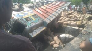 Azamgarh: A truck loaded with rice overturned near the Jiyapur fish market culvert, the driver and the helper narrowly escaped