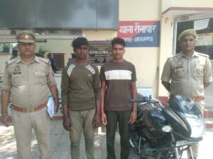 आज बुधवार को उ0नि0 अखिलेश कुमार सिंह हमराह द्वारा चेकिंग के दौरान ग्राम रामनगर कुकरौछी तिराहा से समय करीब 00.50 बजे रात्रि को अभियुक्त 1.दानिश पुत्र अदालत 2.नासिर पुत्र वकील साकिनान खोजौली थाना रौनापार आजमगढ़ को घटना मे प्रयुक्ति मो0सा0सुपर स्पलेण्डर UP50BZxxxx व बकरा काटने मे प्रयुक्त चाकू के साथ नियमानुसार हिरासत पुलिस मे लिया गया। बरामदगी के आधार पर मुकदमा उपरोक्त मे धारा 317(2)बीएनएस व 4/25 आयुध अधिनियम की बढोतरी किया गया।