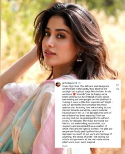 Janhvi highlighted the rich heritage of Indian craftsmanship, noting, “_For decades, the work of our artisans has been exported from our country and put on global platforms without credit. For decades, they have borrowed our fabrics, our embroidery, our textiles, our jewellery and presented it as a creation of which they are the rightful owners._”
