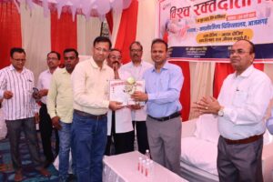 विश्व रक्तदाता दिवस 14 जून 2025 के अवसर पर जिलाधिकारी ने डॉ डी डी सिंह को किया सम्मानित