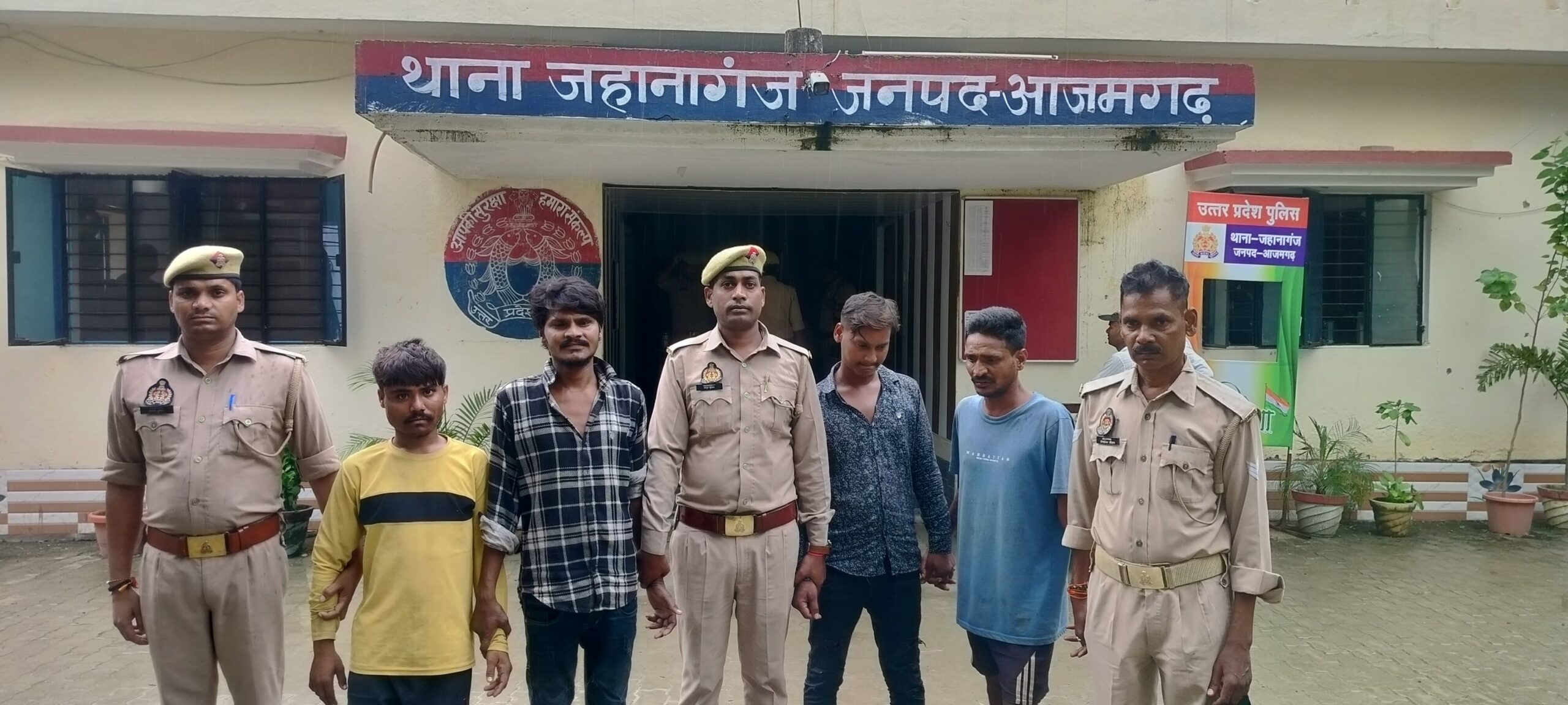 जहानागंज थाना के व0उ0नि0 वीरेंद्र यादव व उ0नि0 शिवम त्यागी मय हमराह द्वारा चेकिंग के दौरान अमदही गांव के पास स्थित बगीचे के पास बंद पड़े स्कूल से 04 अभियुक्तों 1. राजन कुमार उर्फ मुक्का पुत्र करिया नोना निवासी अमदही थाना जहानागंज जनपद आजमगढ़ उम्र 28 वर्ष, 2. बच्चन नोना पुत्र करिया नोना निवासी अमदही थाना जहानागंज जनपद आजमगढ़ उम्र करीब 32 वर्ष, 3. राहुल नोना पुत्र राजेन्द्र नोना निवासी असाऊर थाना मुबारकपुर जनपद आजमगढ़ उम्र करीब 20 वर्ष व 4. राजू कुमार पुत्र श्यामबली निवासी धर्मदासपुर ताजपुर थाना चिरैयाकोट जनपद मऊ उम्र करीब 22 वर्ष को 01 प्रतिबंधित पशु, एक अदद चापड़ लोहे का, एक अदद ठीहा लकड़ी का, एक अदद पीढ़ा लकड़ी, एक अदद अवैध तमंचा 315 बोर, एक अदद जिंदा कारतूस 315 बोर, 03 मोटरसाइकिल के साथ समय करीब 23.05 बजे पुलिस हिरासत में लिया गया। गिरफ्तारी व बरामदगी के आधार पर थाना जहानागंज पर मु0अ0सं0 290/2025 धारा 3/5A/8 गोवध निवारण अधिनियम व 11 पशु क्रूरता अधिनियम व 3/25 आर्म्स एक्ट व 4/25 आर्म्स एक्ट पंजीकृत कर गिरफ्तार अभियुक्तों का चालान मा0 न्यायालय किया गया।