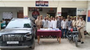 Mau. On Friday night, the Ghosi police arrested six criminals planning a robbery at the Sultanpur turn in the Ghosi area, along with two pistols, a pistol, a car, a bullet, and other weapons, and issued a challan against them under the relevant sections. Under the direction of SP Elamaranji and under the supervision of CO Jitendra Singh, station house officer Pramod Kumar Singh, along with his companions, achieved a major success by arresting six criminals in a car who were planning a robbery at the Asna Canal Sultanpur turn on Madhuban Road, along with illegal weapons. The police laid a siege near the Asna Canal culvert on Sultanpur Road and caught the accused. During this, the police recovered a four-wheeler, a bullet bike, two illegal pistols, two live cartridges, four pairs of anklets, two pairs of toe rings, a pair of yellow metal blisters, and Rs 5,000 in cash from them. The arrested accused were sent to jail after interrogation. Kotwal Pramod Kumar Singh issued a press release stating that the accused included gang leader Brijesh Kumar alias Prince Basfor, resident of Manikpur Asna, Mau; Gaurav Yadav, resident of Siuri Premraja, Bhimpura police station, Ballia; Bhagwan Rajbhar, resident of Asdiha, Ballia; Sonu Rajbhar, resident of Ajorpur, Rampur, Mau; Aryan Yadav, resident of Senuraich, Kopaganj, Mau; and Praveen Yadav, resident of Devkali, Vishunpur, Kopaganj. According to police, Brijesh Kumar already has 14 cases registered against him. A pistol and live cartridges were recovered from him. Similarly, accused Gaurav Yadav has two cases registered against him in Ballia district, Bhagwan Rajbhar has two cases registered against him, and Sonu Rajbhar has three cases registered against him in Rampur, Mau. During interrogation, the accused admitted to breaking into the locker of the UP Baroda Gramin Bank in Amila Thanidas on July 12th, burgling Rambadan Yadav's house in Patkhauli on August 12th, and stealing from Manai Gupta's locked house on September 2nd. This action was carried out under the supervision of CO Jitendra Singh on the orders of Superintendent of Police Ilamaran. Inspector-in-Charge Pramod Kumar Singh was accompanied by Sub-Inspectors Shankar Kumar Yadav, Ashok Singh, Sanjay Upadhyay, Pawan Kumar, Shriprakash Singh, Suraj Singh, Akash Srivastava, Head Constable Ratnakar Singh, Rajit Yadav, Rinku Kumar, Digvijay, Shoaib Alam, Sandeep Sangam, and Akhilesh Kumar.