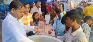 Mau News:व्यापारमण्डल घोसी के द्वारा मेले में आये श्रधालुओ को प्रसाद का वितरण किया गया।