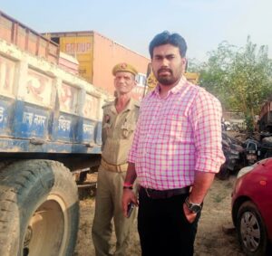चित्र परिचय: पकड़े गए ट्रैक्टर के साथ अधिकारी।
