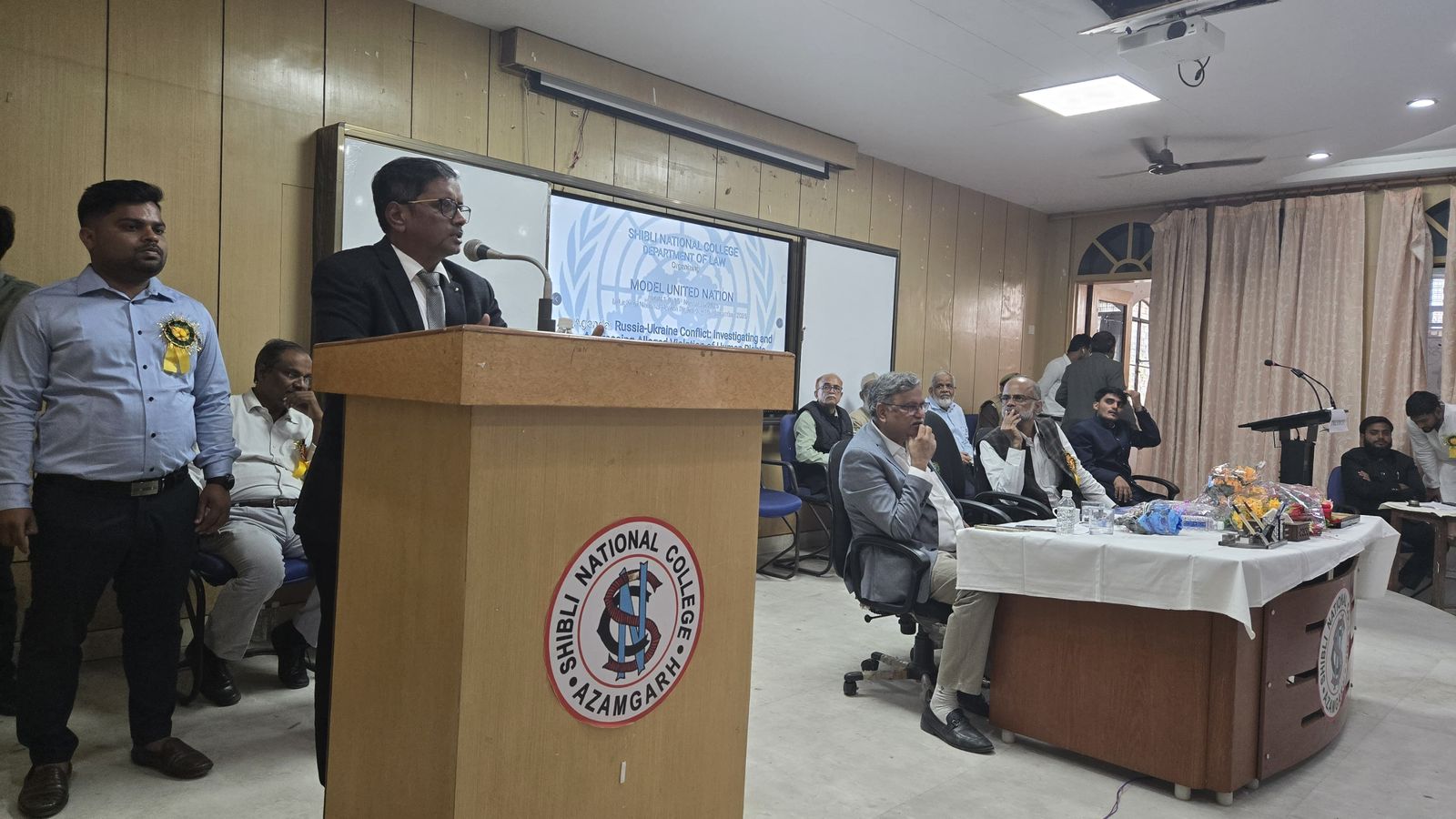 आजमगढ़:शिब्ली नेशनल कॉलेज के विधि विभाग द्वारा मॉडल यूनाइटेड नेशंस (MUN) 1.0 का सफल आयोजन किया गया। कार्यक्रम का विषय “रूस–यूक्रेन संघर्ष: मानवाधिकार उल्लंघन के आरोपों की जाँच और समाधान” रखा गया, जिसमें विधि विभाग के विद्यार्थियों ने विभिन्न देशों के प्रतिनिधि बनकर वैश्विक मुद्दों पर गहन एवं विचारपूर्ण चर्चा में भाग लिया।यह आयोजन महाविद्यालय के प्राचार्य प्रो. अफसर अली के मार्गदर्शन में सम्पन्न हुआ। कार्यक्रम की अध्यक्षता विधि विभाग के अध्यक्ष प्रो. काज़ी नदीम आलम ने की तथा संचालन प्रो. खालिद शमीम द्वारा किया गया।प्राचार्य प्रो. अफसर अली ने अपनी उपस्थिति से कार्यक्रम की गरिमा को बढ़ाया और आयोजकों व प्रतिभागियों के प्रयासों की सराहना की। उन्होंने कहा कि विधि विभाग न केवल महाविद्यालय में, बल्कि पूरे आज़मगढ़ में अपनी विशिष्ट पहचान रखता है। विभाग के योगदान को रेखांकित करते हुए उन्होंने विश्वास व्यक्त किया कि विभाग के ये सक्रिय विद्यार्थी भविष्य में महाविद्यालय का नाम और अधिक रोशन करेंगे।कार्यक्रम में मुख्य अतिथि के रूप में मुकेश कुमार सिंह, प्रेसीडिंग ऑफिसर, मोटर दुर्घटना दावा अधिकरण, आज़मगढ़, ने शिरकत की। अपने उद्बोधन में उन्होंने कॉलेज एवं विधि विभाग को इस उपयोगी एवं प्रभावी आयोजन के लिए बधाई दी और छात्रों को ऐसे मंचों पर सक्रिय भागीदारी के लिए प्रेरित किया। उन्होंने अपने अनुभव साझा करते हुए कहा कि इस प्रकार के आयोजन विद्यार्थियों के शैक्षणिक एवं व्यक्तित्व विकास के लिए अत्यंत महत्त्वपूर्ण हैं।कार्यक्रम का समापन प्रतिभागियों, संकाय सदस्यों एवं आयोजकों के प्रति धन्यवाद ज्ञापन के साथ हुआ। MUN 1.0 को सफल बनाने में सभी का सहयोग सराहनीय रहा।