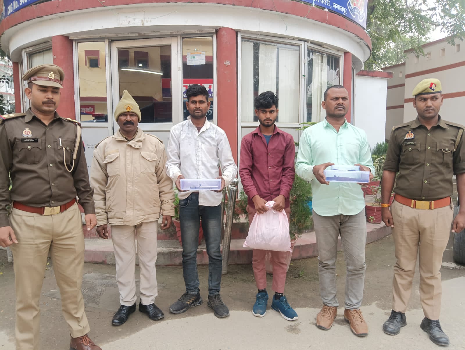 1. अरविन्द बहेलिया पुत्र हरनाम सिंह, निवासी चिरकुटी, थाना विशुनगढ़, जनपद कन्नौज (उम्र 30 वर्ष) 2. पंकज निषाद पुत्र मनीराम, निवासी कुर्चा, थाना बेवाना, जनपद अम्बेडकरनगर (उम्र 35 वर्ष) 3. संजीव बहेलिया उर्फ सुल्ली पुत्र हरनाम सिंह, निवासी चिरकुटी, थाना विशुनगढ़, जनपद कन्नौज (उम्र 23 वर्ष) तलाशी लेने पर इनके पास से 1.438 किलोग्राम नाजायज़ गांजा तथा दो अवैध तमंचा .315 बोर ,दो जिंदा कारतूस,₹850 नकद बरामद हुआ।