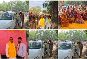 Azamgarh news:जन चौपाल में जाते समय ओमप्रकाश राजभर की स्कोर्ट गाड़ी गड्ढे में फंसी, ग्रामीण बने मददगार