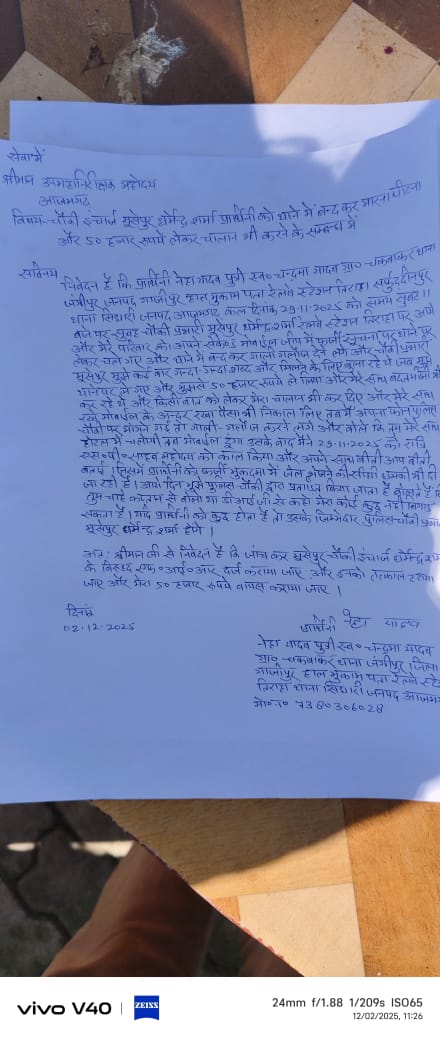 आजमगढ़ जिले के सरफुद्दीनपुर तिराहे पर एक रेस्टोरेंट पर काम कर रही युवती ने मूसेपुर चौकी प्रभारी पर गम्भीर आरोप लगाते हुए डीआईजी से मिलकर प्रार्थना पत्र दिया है। पीड़ित युवती ने दिए गए प्रार्थना पत्र में कहा कि मूसेपुर चौकी प्रभारी धर्मेंद्र शर्मा ने फर्जी तरीके से बिना किसी अपराध के 29 नवंबर को करीब 11:30 बजे अपनी पुलिस टीम के साथ पुलिस सेकंड मोबाइल गाडी से मेरे रेस्टोरेंट पर आए और रेस्टोरेंट पर काम कर रही पीड़ित युवती और उसमे काम करने वाले मजदूरों एवं रेस्टोरेंट के मालिक उनकी पत्नी एवं दूधमुंहे बच्चे को जबरदस्ती गाडी में बैठा लिया,