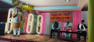 लालगंज/आजमगढ:नगर पंचायत लालगंज के संस्कार मैरिज हाल मे आयोजित प्रमुख जन गोष्ठी का शुभारम्भ डा0 वीरेंद्र जायसवाल क्षेत्र कार्यवाह पूर्वी उत्तर प्रदेश, राजेन्द्र जी सहविभाग संघचालक व अखिलेश जी जिला संघ चालक ने भारत माता के चित्र पर दीप प्रज्वलित व पुष्प अर्पित कर किया। कार्यक्रम को संबोधित करते हुए डा0 वीरेंद्र जायसवाल ने कहा कि सनातन हिंदू धर्म में जाति प्रथा जन्म आधारित नहीं कर्म एवं अर्थ आधारित व्यवस्था है।हमारे पुरातन मूल्यों में अस्पृश्यता का कोई स्थान नहीं है।हम सभी हिन्दू बराबर हैं कोई ऊंच-नीच का विभेद नहीं। मर्यादा पुरुषोत्तम श्रीराम का मित्र अगर कोई था तो निषादराज
