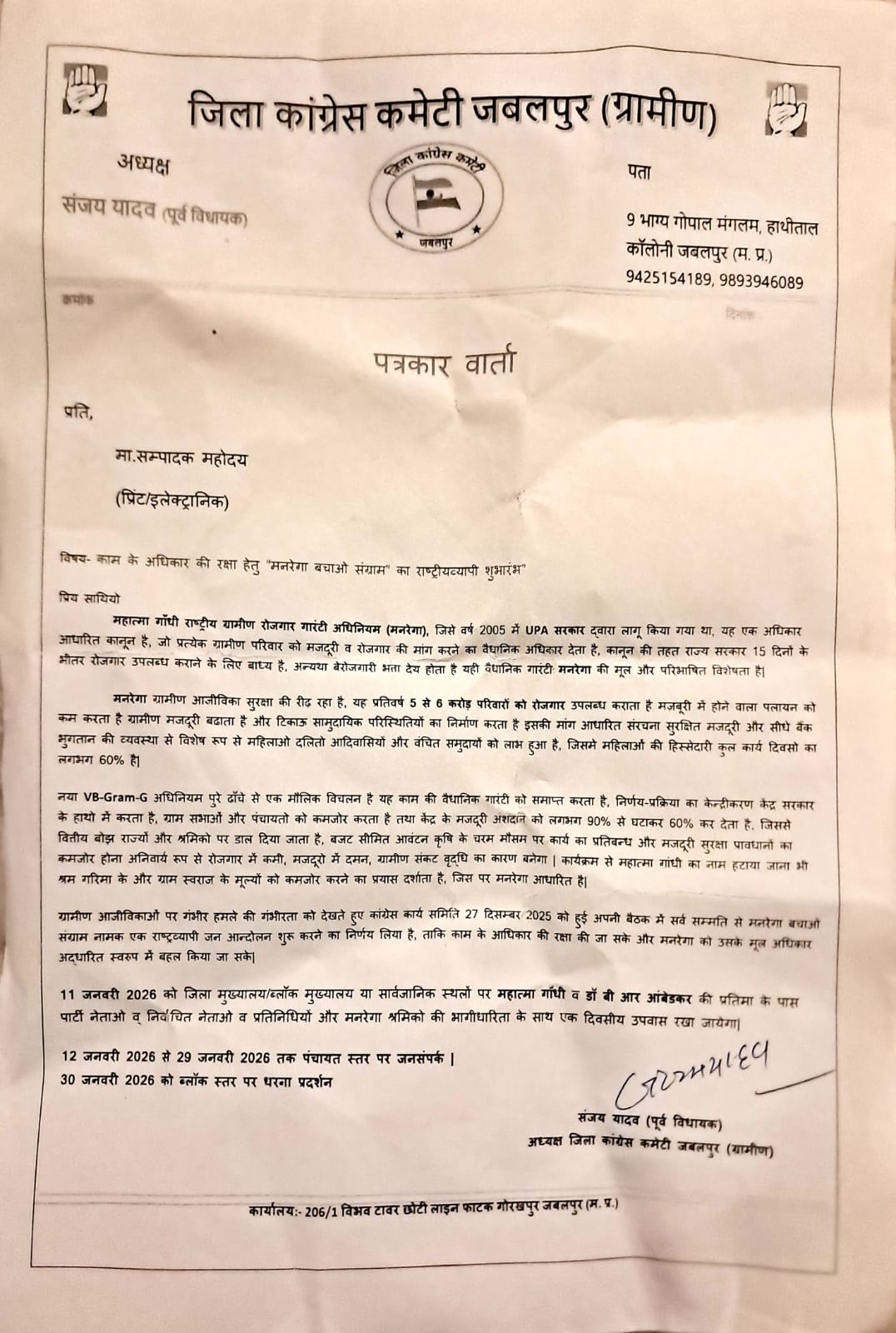 Jabalpur news:मनरेगा के अधिकार आधारित स्वरूप को खत्म करने का आरोप, 11 जनवरी को उपवास