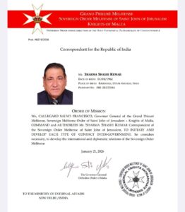 नई दिल्ली / कॉन्स्टेंटिनोपल | 21 जनवरी 2026 सॉवरेन ऑर्डर मेलिटेंस ऑफ़ सेंट जॉन ऑफ़ जेरूसलम (ऑर्थोडॉक्स नाइट्स ऑफ़ माल्टा) ने भारत गणराज्य के साथ औपचारिक राजनयिक संबंध स्थापित करने की दिशा में पहल की है। इस संबंध में ऑर्डर के ग्रैंड प्रिये मेलिटेंस के गवर्नर जनरल, कैलेगरो साल्वो फ्रांसेस्को की ओर से भारत के विदेश मंत्री डॉ. एस. जयशंकर को आधिकारिक नोटा वर्बल और प्रस्ताव भेजा गया है।ऑर्डर ने भारत में एक डिप्लोमैटिक मिशन हेडक्वार्टर खोलने और द्विपक्षीय संबंधों की शुरुआत के लिए भारत सरकार से मान्यता (Accreditation) का अनुरोध किया है। प्रस्ताव में ऑर्डर ने स्वयं को अंतरराष्ट्रीय कानून के अंतर्गत एक सॉवरेन सब्जेक्ट बताते हुए अपने ऐतिहासिक, कानूनी और मानवीय कार्यों का उल्लेख किया है।इस अवसर पर श्री शर्मा शशि कुमार (जन्म: 14 अप्रैल 1962, रायबरेली, उत्तर प्रदेश; पासपोर्ट संख्या: IND Z8135846) को ऑर्डर का कॉरेस्पोंडेंट नियुक्त किया गया है।