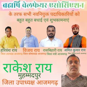 आजमगढ़ जनपद में ब्रह्महर्षी वेलफेयर एसोसिएशन उत्तर प्रदेश, बिहार सहित देश के लगभग आठ राज्यों में तेजी से अपने संगठन का विस्तार कर रहा है। यह संगठन भूमिहार समाज की एकता, जागरूकता और सामाजिक उत्थान का प्रतीक बनकर उभर रहा है। समाज के लोगों को एकजुट करने, सामाजिक चेतना बढ़ाने तथा युवाओं को संगठन से जोड़ने के उद्देश्य से संगठन लगातार सक्रिय भूमिका निभा रहा है। इसी क्रम में संगठन को और अधिक मजबूत बनाने के लिए आजमगढ़ जनपद के संरक्षकगण, मार्गदर्शकगण तथा वरिष्ठ सदस्यों के साथ विस्तृत विचार-विमर्श कियिकली गया। इसके बाद प्रदेश कार्यकारिणी और राष्ट्र कार्यकारिणी के अनुमोदन से विभिन्न पदों पर नई जिम्मेदारियों की घोषणा की गई। एसोसिएशन द्वारा विपिन राय, जो मूल रूप से जनपद आजमगढ़ के निवासी हैं और वर्तमान में लखनऊ में रह रहे हैं, को उत्तर प्रदेश का प्रदेश महामंत्री नियुक्त किया गया है। वहीं मोहम्मदपुर लाटघाट निवासी राकेश राय को जिला उपाध्यक्ष, रोहुवार निवासी हरिवंश राय को जिला उपाध्यक्ष, रोहुवार निवासी रासबिहारी राय को जिला मंत्री, रोहुवार निवासी अमित कुमार राय को जिला मीडिया प्रभारी तथा हसनपुर निवासी विजय कुमार राय को जिला कोषाध्यक्ष की जिम्मेदारी सौंपी गई है।