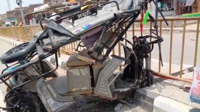 ट्रेलर की टक्कर से ई-रिक्शा क्षतिग्रस्त