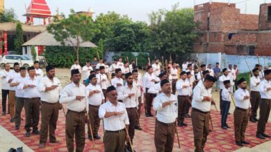 Azamgarh news:आरएसएस ने माहुल में निकाला जागरूकता रथ और पथ संचलन, नागरिकों ने की पुष्पवर्षा