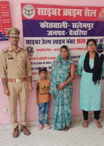 सलेमपुर बिन्दा यादव पत्नी मुकेश यादव निवासी राजा का किला मठिया मझौलीराज सलेमपुर निवासी, वृंदा यादव पत्नी मुकेश यादव वर्तमान पता सहारा बैंक की गली में J.K हास्पिटल के पीछे, हरैया थाना सलेमपुर देवरिया द्वारा लगभग 12.00 बजे आकर कोतवाली थाना सलेमपुर में सूचना दी कि उनका पुत्र जिसका नाम सिध्दार्थ यादव, उम्र 08 वर्ष, अचानक कहीं चला गया है । इस सूचना पर प्रभारी निरीक्षक सलेमपुर संतोष कुमार द्वारा त्वरित कार्यवाही करते हुए बच्चे को ढुढने के लिए पुलिस टीम गठित की गठित पुलिस टीम बच्चें की तलाश में जुट गई, जिसके परिणामस्वरूप 01 घण्टे के अन्दर बच्चे को टाउन एरिया सलेमपुर से एक ठेले के दुकान के पास से बरामद कर लिया एवं बच्चों को उसके माँ को सकुशल सुपुर्द कर दिया । बच्चों की मां द्वारा सलेमपुर पुलिस के प्रति आभार व्यक्त किया